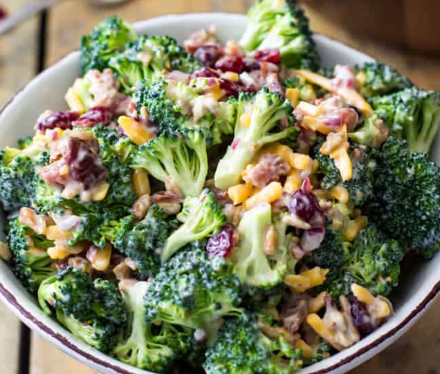 Broccoli Salad Ingredients: 1 bunch broccoli, chopped 1 small purple onion, chopped 1/2 c raisins 1/2 c sunflower seed kernels 8 oz bacon, crisp cooked, and crumbled Sweet and Sour Dressing: 1/4 c white vinegar 1/4 c sugar 1 c mayonnaise Instructions: Combine first five ingredients in salad bowl. Then combine the dressing ingredients in a separate bowl. Pour over salad and let set for a few hours before serving.