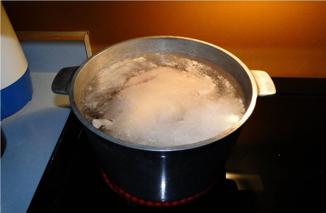 Start with a whole fryer chicken. Cover it with water and a tablespoon of salt. Boil it for about an hour and a half. (Be sure and remove the neck and other “yucky stuff” that might be inside the chicken before you boil it.) After the chicken is cooked through, remove the whole chicken to a 9 x 13 pan and let it sit until it cools. Later on in the process, you will have to “de-bone” the chicken. This should really be called “de-meat” the chicken. You will have to roll your sleeves up and be willing to get a little messy as you pull all of the meat off of the chicken. But you want to make sure it is cool first. (Or you might be able to convince a friend that you are not the Little Red Hen and if they want to share this great dish with you, then they need to help you!!)