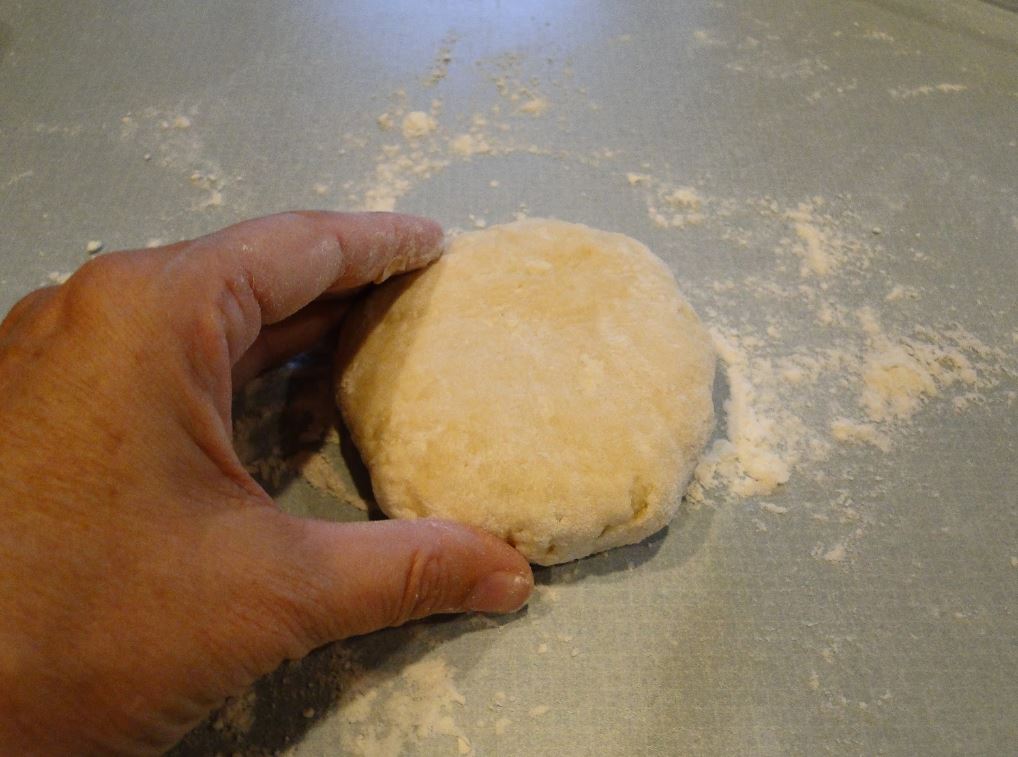 Add about 4 heaping large spoons of flour into the egg mixture. Stir. This is the critical part – the mixture needs to form a ball that is neither too dry nor too wet. It takes about a minute to stir in the flour. If it is still wet in some parts, add a little more flour.