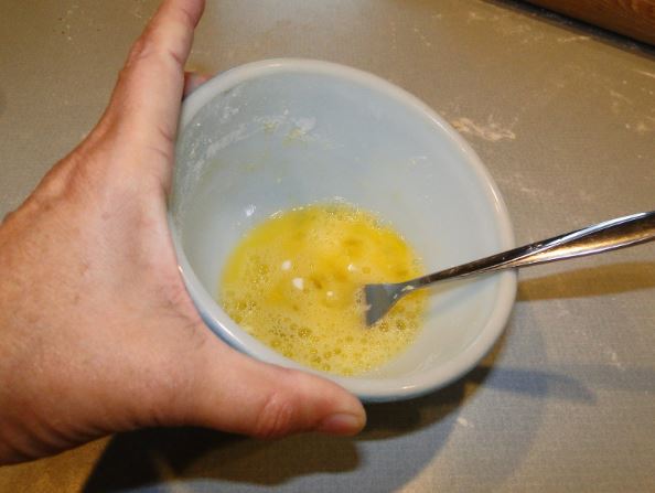 Crack one egg in the small bowl and add “half an egg shell” of water. Add “some” salt (about a half a teaspoon) and a “knife tip” of baking powder. Now you see why this recipe is hard to write down or simply explain.