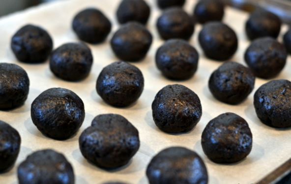 Pour into bowl with cream cheese. Mix until it holds together. Roll into 1 inch balls and place on wax paper on cookie sheet. (I have a small cookie scoop that I use to help keep the balls a bit more uniform but that is not necessary.) Put in fridge for about 30 minutes.