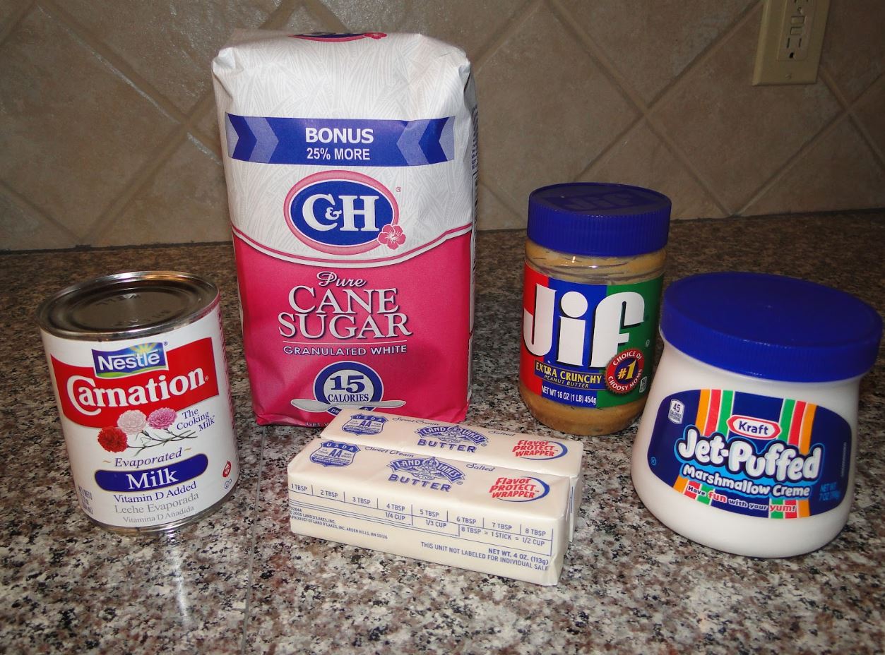 Remove from heat and stir in peanut butter and marshmallow creme. Beat vigorously until smooth. Poor quickly into buttered dish. Let cool completely before cutting into squares.